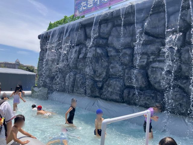 例年大好評の巨大滝のプールを今年も実施いたしました。