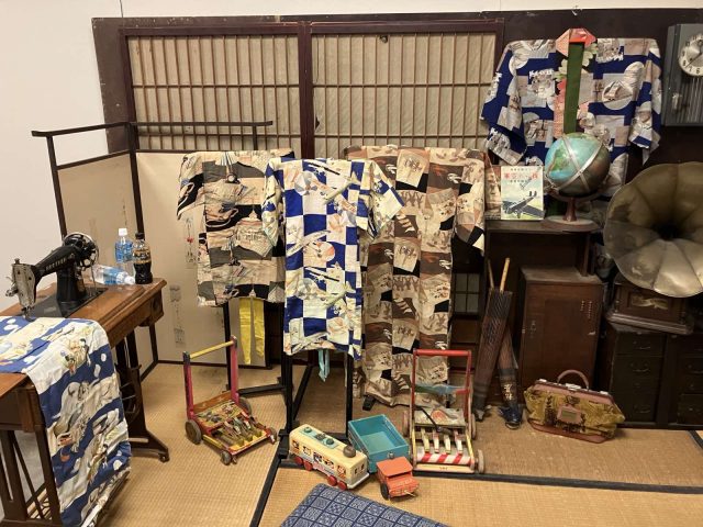 戦時中着用していた着物の展示。絵柄が戦闘機や戦車で当時を物語っています。