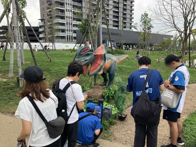屋外の各箇所へセンサーで動く恐竜ロボットを配置し、観覧いただきました。