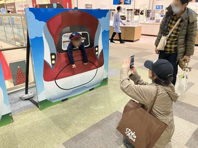 駅員の制服を着て記念撮影。お子様がかわいい駅員さんになります。